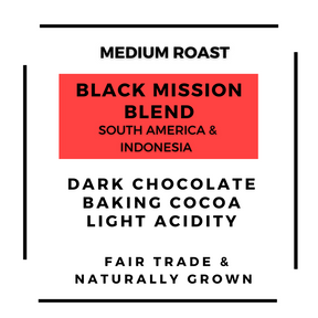 The Black Mission Blend shouts out chocolate, chocolate, chocolate! If you like chocolate, this blend is for you. It is very cocoa forward but not in a bitter cocoa way. It is very well balanced with mild acidity. It leaves your mouth clean and has a hint of citrus.
