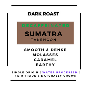 We finally found it! The perfect Sumatra Select Water Decaffeinated coffee. It is Fair Trade, Naturally Grown and is sourced from small farms in the Takengon region of Sumatra. Most farms are around 1/2 acre or less.