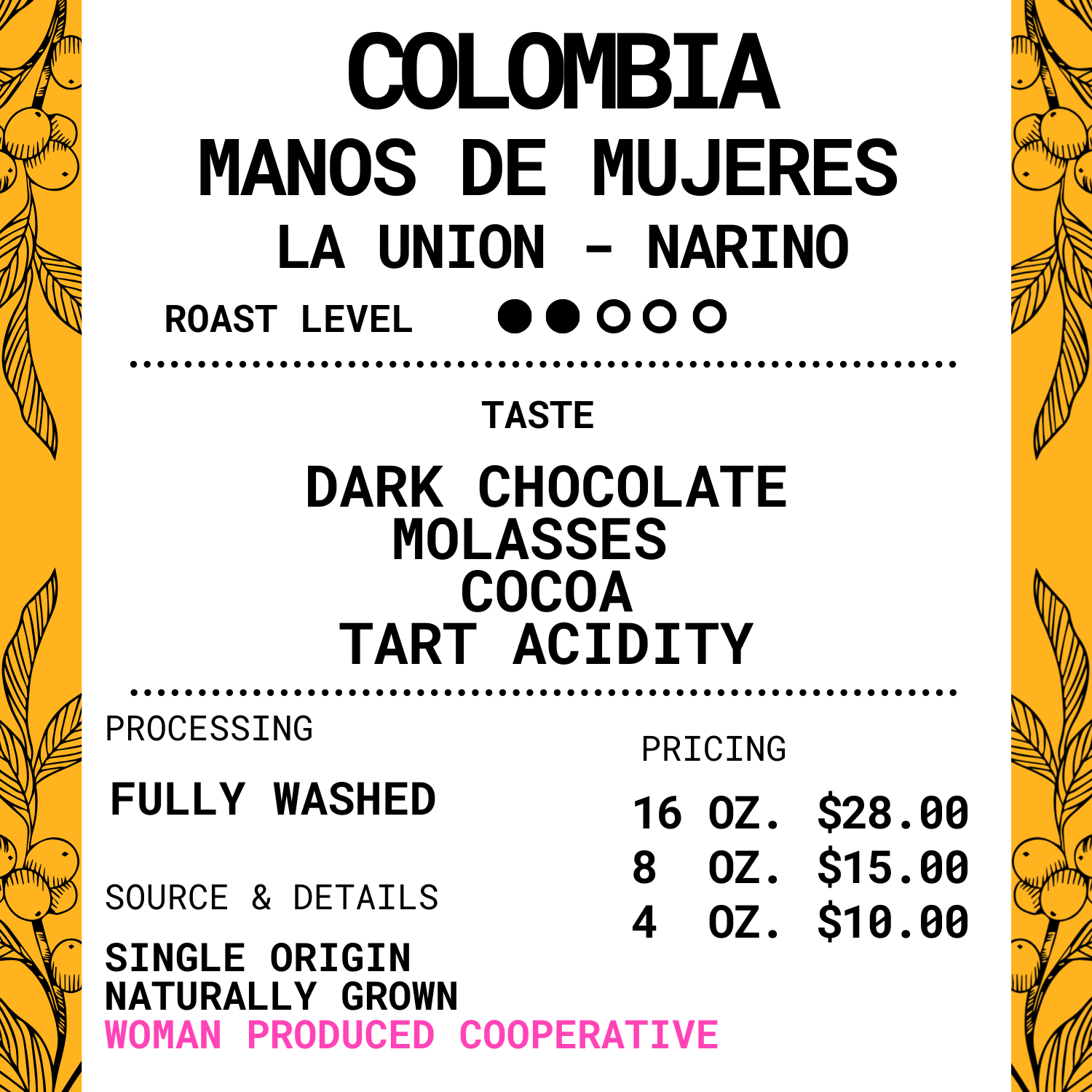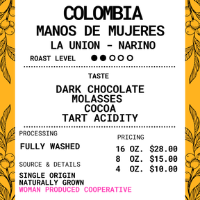 This Colombia boasts some strong dark chocolate, molasses and cocoa notes. It has a great sugary sweetness but balanced with some tart acidity to even the profile. Upon cool-down the finish is more clean.